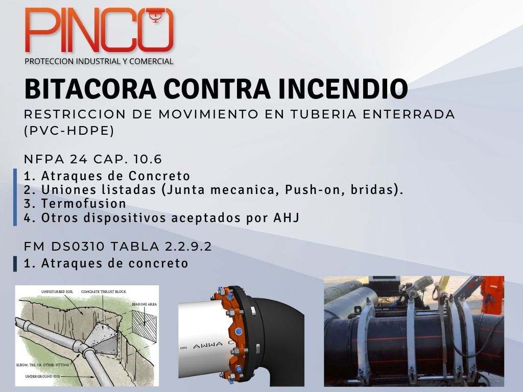 Conoce cómo la NFPA y FM Global regulan el uso de restrictores en tubería enterrada contra incendio y cuándo sustituir atraques de concreto.